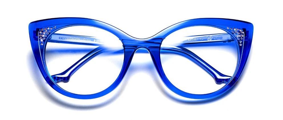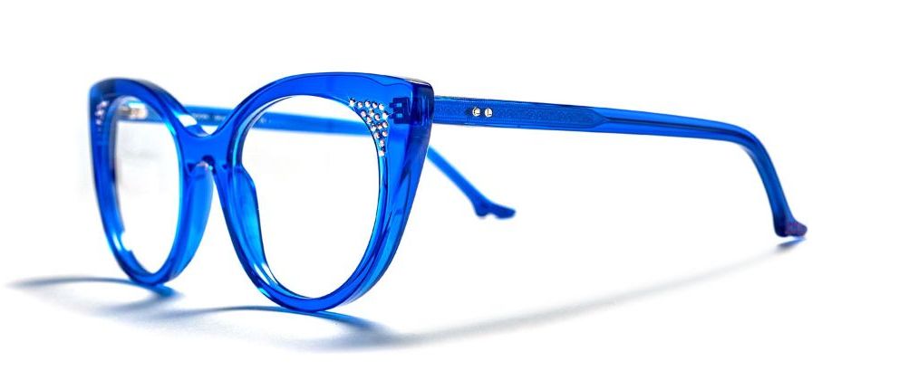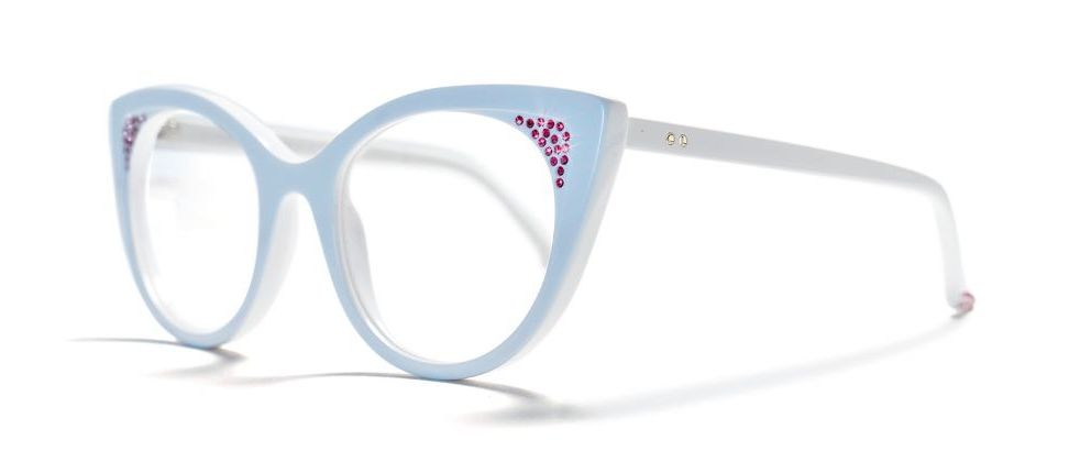 Optical frame in solid white inlaid with ruby red crystals.